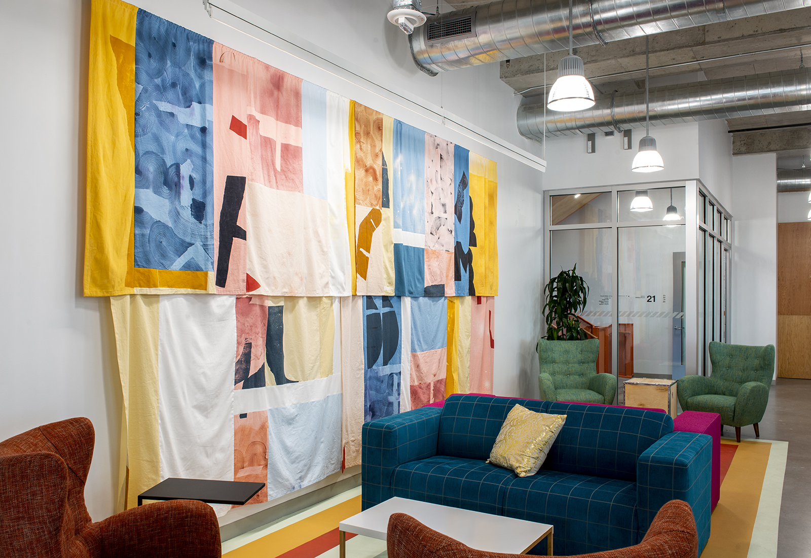 Over the course of six weeks, 52 custom yards of fabric were produced for the large-scale installation. A complementary mural was painted at the adjacent stairwell.